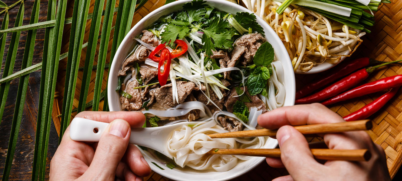 Rindfleischsuppe mit Zitronengras, Reisnudeln, Rind- und Hähnchenfleisch mit Frühlingszwiebeln, Sojasprossen, frischen Kräutern