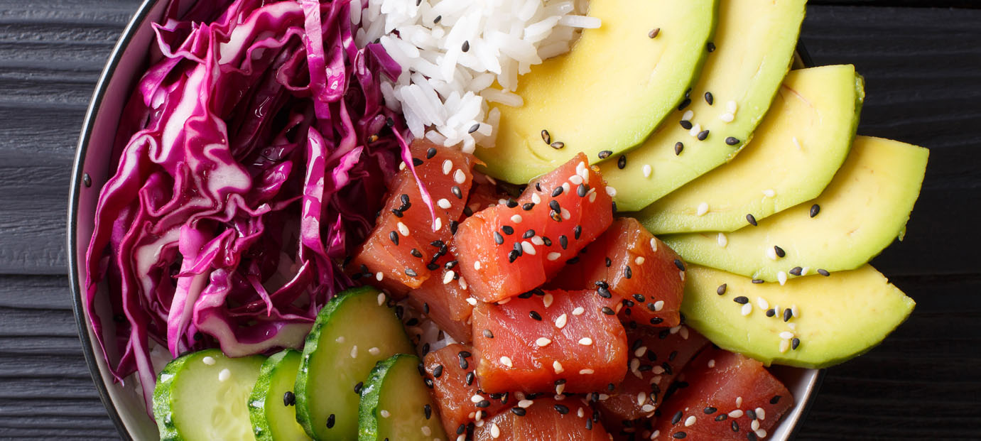 Mariniertes Lachsfilet mit frischem Rucola Salat, Sesam und Duftreis als Beilage