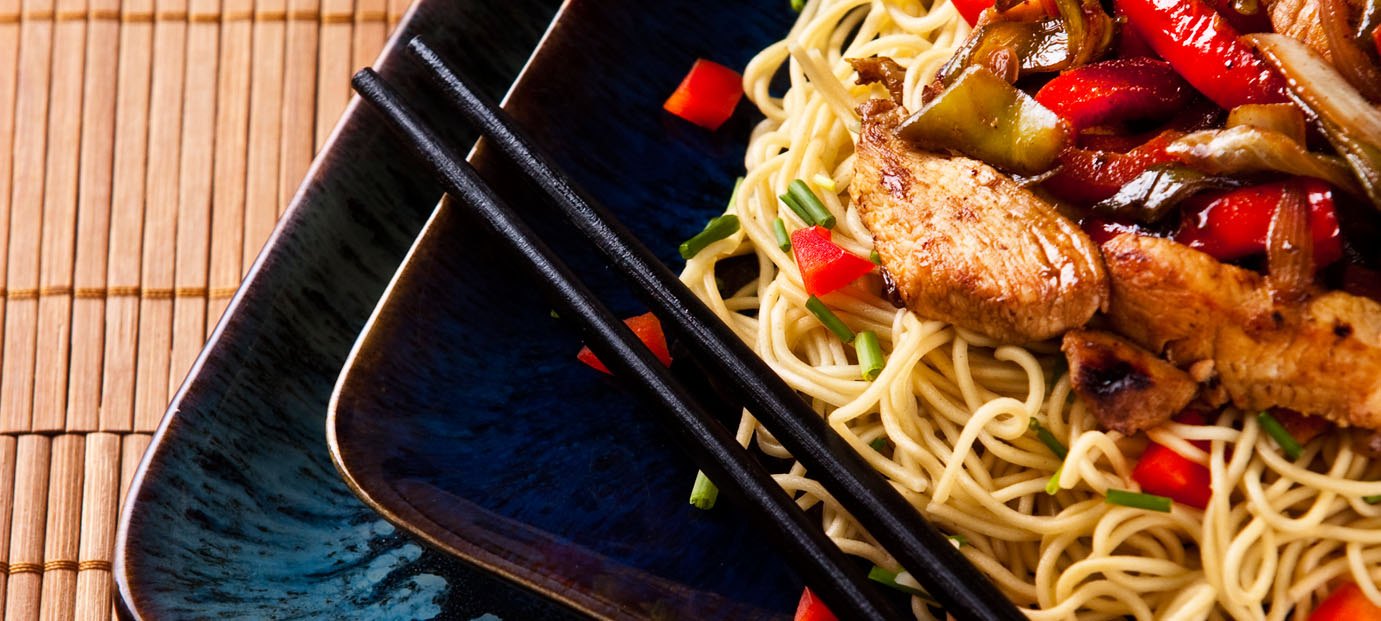 Gebr. Eiernudeln mit Ei, Zwiebeln, Sojasprossen, Kurkuma mit Curry Geschmack und verschiedenem frischen Gemüse. Wahlweise mit: