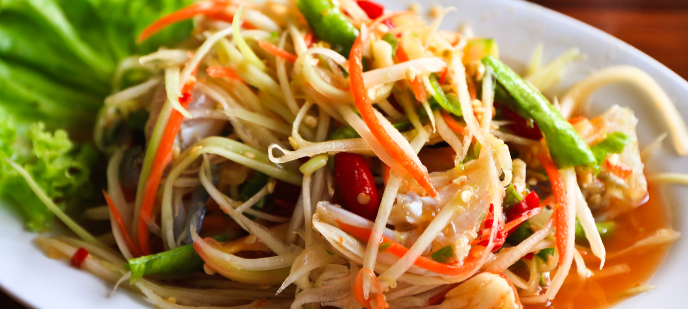 Grüne Papaya Salat mit frischen Kräutern, Karotten, Erdnüsse und Röstzwiebeln. Wahlweise mit: