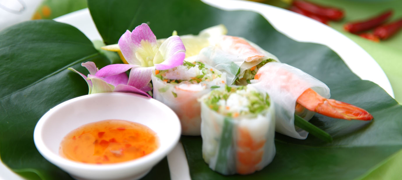 Vietnamesische Sommerrollen Reispapier gefüllt mit Garnelen, Reisnudeln, Salat und frische Minze dazu Hoisin Sauce mit Erdnüsse (n,e) oder Limetten-Fischsauce (d)