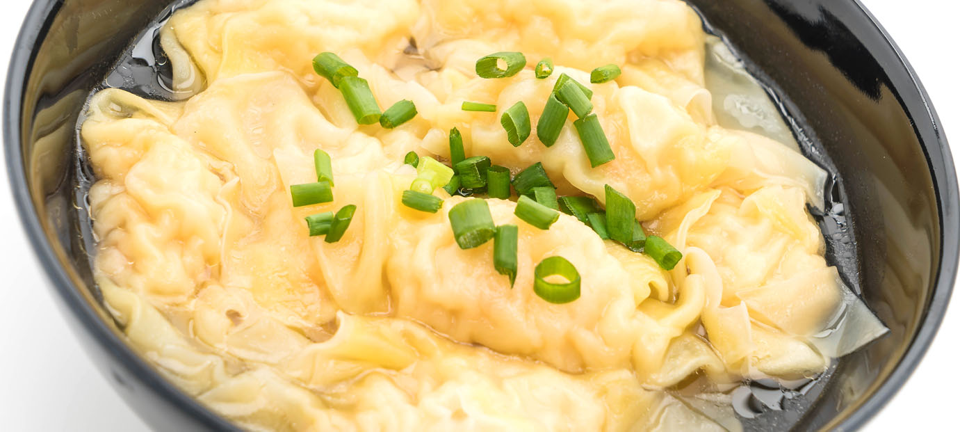 Hühnersuppe mit dünnen Eiernudeln, Wan-tan gefüllt mit Hühnerfleisch und Garnelen, Röstzwiebeln und Frühlingszwiebeln